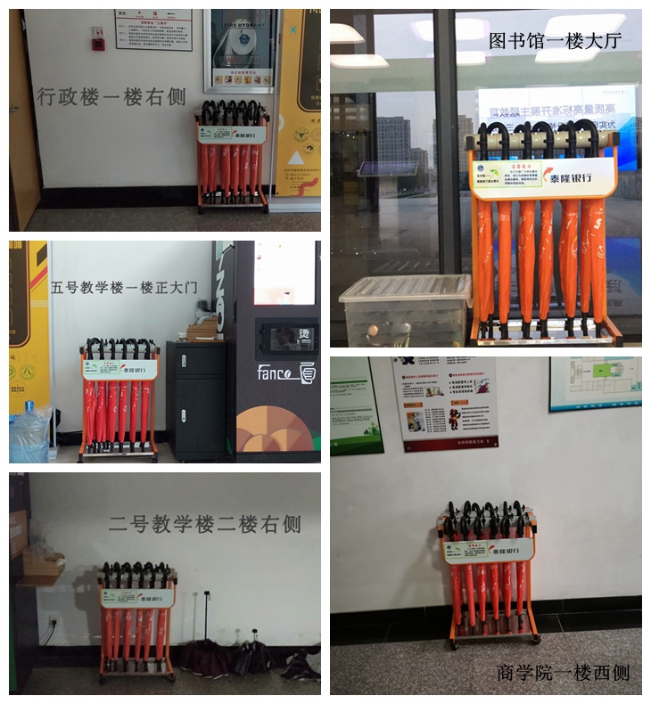 12月5日,9001cc金沙首页联合泰隆商业银行在我校进行爱心送伞公益活动。首批150把爱心雨伞和5个伞架已投放到行政楼一楼大厅、图书馆一楼大厅、9001cc金沙首页大楼一楼西门口、2号教学楼二楼和5号教学楼一楼咖啡机旁,供师生免费使用。