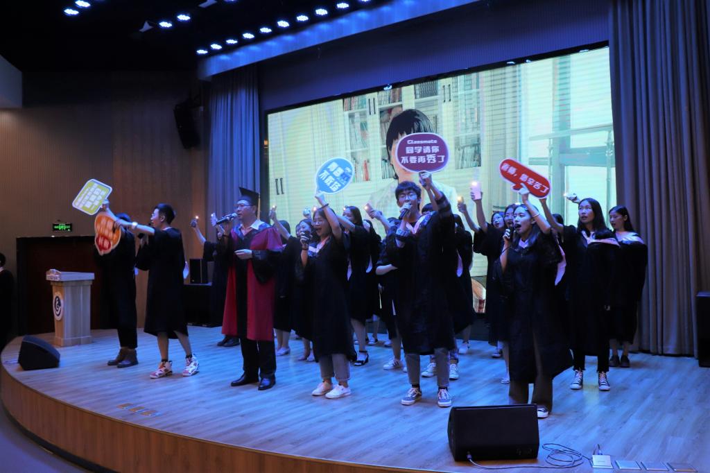 崔凤军书记作毕业致辞,他以小王子中的经典语段为开头,以古往今来的经典送别诗文为载体,向大家传达了自己的不舍之情和对毕业生即将载梦远航的美好祝愿。同时,他向全体毕业生们提出三点希望:学会自信,肯定自我独特优势,永远充满热情;学会自律,在绚烂中保持冷静,在喧嚣中听从内心;学会自强,不惧前路漂泊与艰辛,奋力拼搏,始终如一。并以一句慷慨激昂的“愿归来依然少年”作结,道出了“一日台院人,一生台院情”的赤子之心。最后,在温馨的毕业短片后,崔凤军书记与优秀毕业生代表一起登场倾情演唱《朋友》,为全体毕业生送别,崔凤军的深情嘱托和真挚祝福掀起整个毕业典礼的高潮。