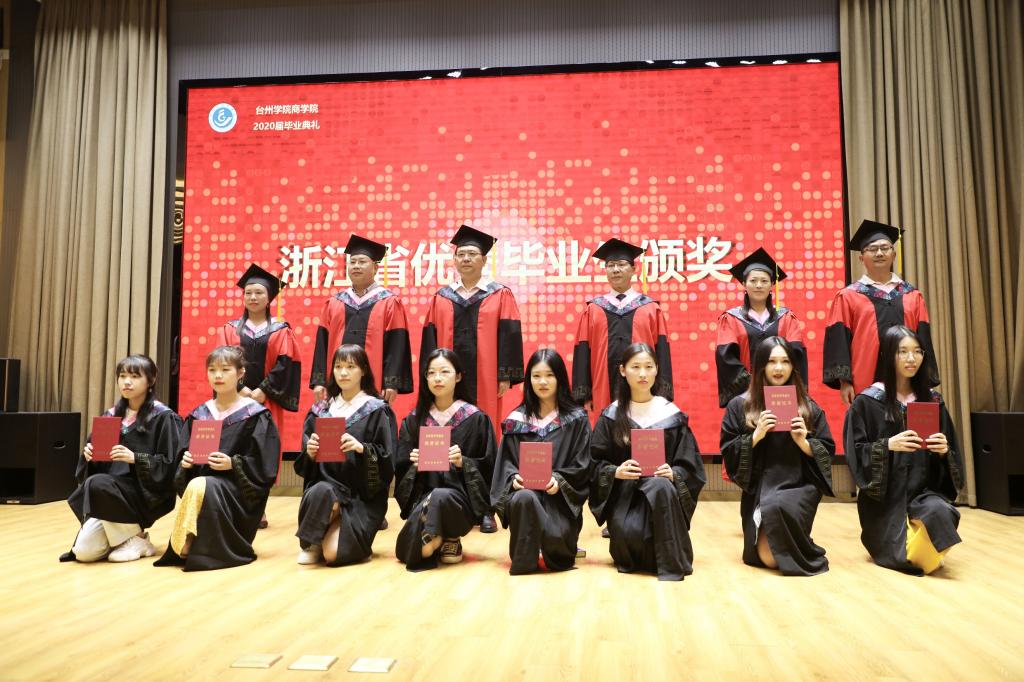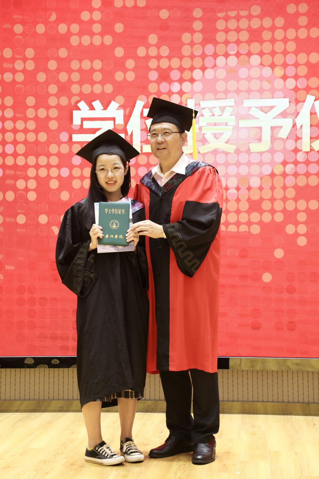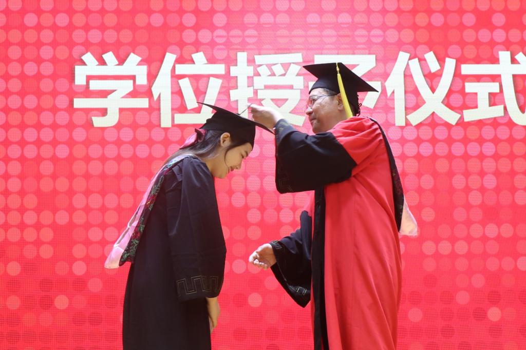 伴随着庄严的国歌,毕业典礼正式开始。首先,周全宝书记宣读2020届省优、校优毕业生文件;校、院领导们上台为冯婷亭等16名省优毕业生代表颁奖。随后,校友联络大使聘任仪式举行,各班班主任们亲手为班级校友联络大使颁发聘书,并希望大家能充分发挥自身作用,当好校友与母校之间的桥梁。在学位授予仪式环节中,崔凤军书记亲自为学士学位获得者代表拨穗,颁发学士学位证书并赠书合影留恋,给予毕业生拥抱和鼓励。