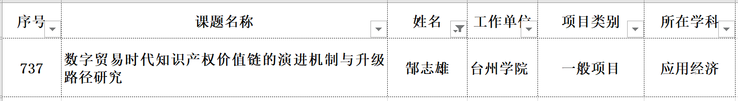 9月24日,全国哲学社会科学工作办公室发布2021年国家社科基金年度项目,9001cc金沙首页郜志雄博士主持的《数字贸易时代知识产权价值链的演进机制与升级路径研究》获应用经济一般项目。这是继8月23日《县域文化和旅游融合体制机制运行质量研究》获国家社科基金艺术学项目立项后,9001cc金沙首页再获国家社科基金项目。