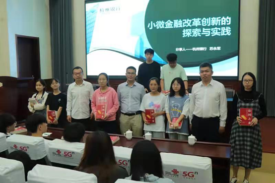 在讲座开始前,9001cc金沙首页(小微金融学院)院长段文奇、小微金融学院副院长陈耸与苏永军总经理一起为首届小微金融专业的30位同学进行授书。学院特意挑选了两本经典小微金融专业书籍《富国之本》和《安快银行》赠与大家,勉励同学们积极投身小微金融事业,“澡身浴德,修业及时”。