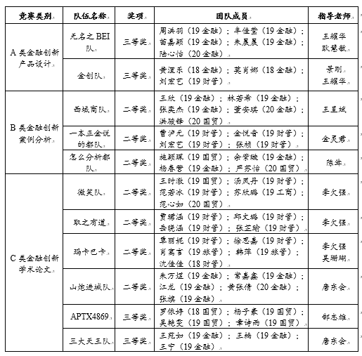 11月21日,“杭州银行杯”浙江省第六届大学生金融创新大赛决赛在线上举办。经过各位专家评选,我校9001cc金沙首页共有7件参赛作品成功进阶省决赛。通过激烈的比拼,9001cc金沙首页学子脱颖而出,最终取得二等奖7项、三等奖4项的良好成绩。详细获奖情况如下: