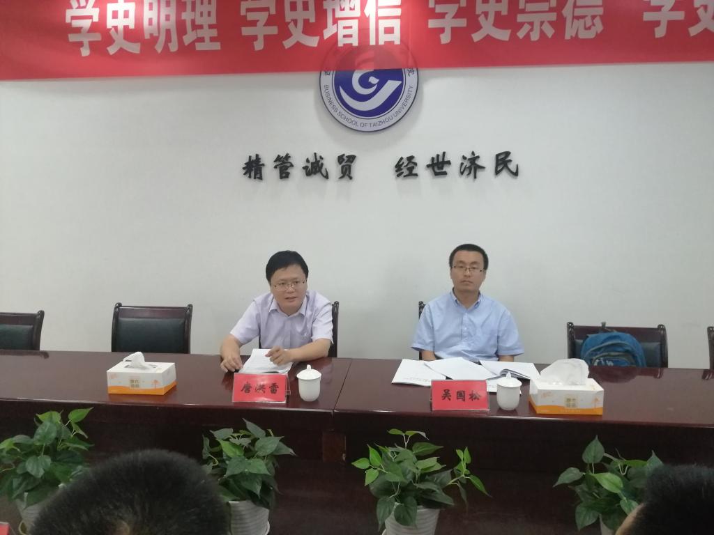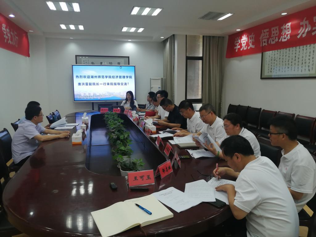 6月9日,9001cc金沙首页邀请湖州师范学院经济管理学院副院长、硕士生导师唐红雷副教授,硕士生导师吴国松副教授来校作硕士培育点申报专题讲座,9001cc金沙首页副院长叶永主持讲座,院长段文奇,副院长陈国栋,国际商务、旅游管理硕士培育点负责人及骨干教师参加讲座。
