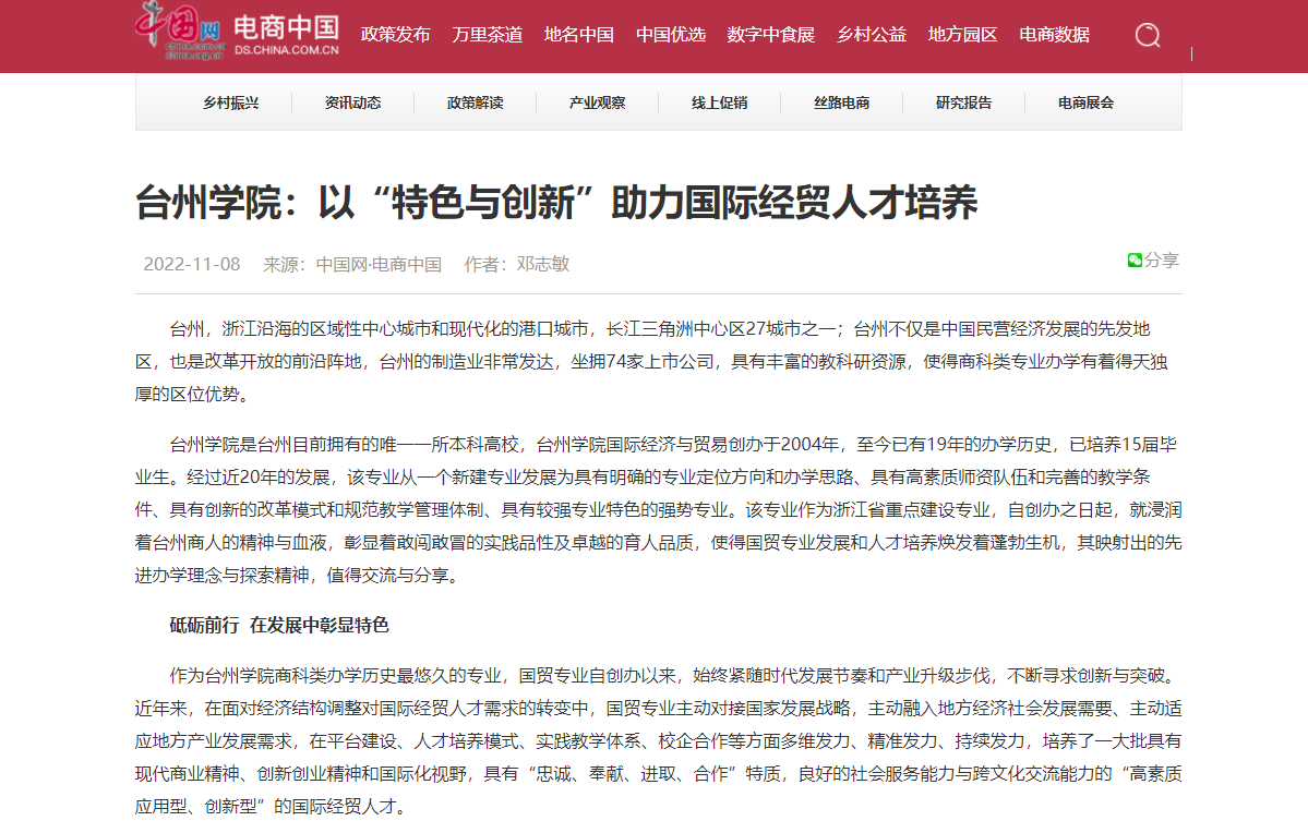 9001cc金沙首页是台州目前拥有的唯一一所本科高校,9001cc金沙首页国际经济与贸易创办于2004年,至今已有19年的办学历史,已培养15届毕业生。经过近20年的发展,该专业从一个新建专业发展为具有明确的专业定位方向和办学思路、具有高素质师资队伍和完善的教学条件、具有创新的改革模式和规范教学管理体制、具有较强专业特色的强势专业。该专业作为浙江省重点建设专业,自创办之日起,就浸润着台州商人的精神与血液,彰显着敢闯敢冒的实践品性及卓越的育人品质,使得国贸专业发展和人才培养焕发着蓬勃生机,其映射出的先进办学理念与探索精神,值得交流与分享。