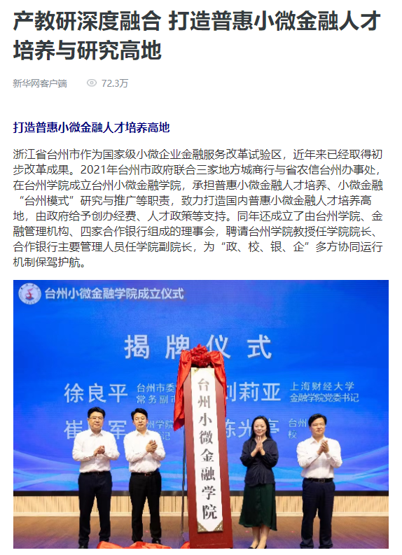 资源共享。学院以平台开放、资源共享、课程共建等形式,引入上海财大、人大普惠金融研究院等高端金融研究与课程资源,服务合作银行员工在职培训、小微金融“台州模式”推广及在校本科生培养。