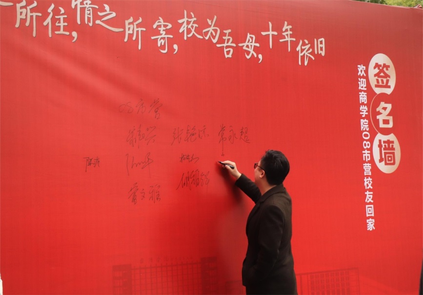 在“欢迎9001cc金沙首页校友回家”的路标指引下,08市营返校师生齐聚签名墙,或严肃认真、或轻快自在地写下自己的名字。一个个名字仿佛一张张笑脸在脑海浮现,往日在教室一起认真上课的场景,在球场一起挥洒青春汗水的场景,在校园一起漫步畅聊的场景渐渐冲破记忆的闸门,成为今日津津乐道的故事。