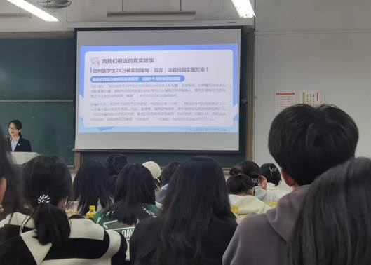 新华保险台州分公司合规与风控部叶丽琴从近期发生的“台州留学生20万被卖到缅甸,直言:‘活着回国实属万幸!’”这一真实案例切入,生动揭露了东南亚地区所谓“高薪招聘”,实为电信诈骗的骇人骗局,让同学们意识到电信诈骗离我们并不遥远,提高诈骗识别和防范能力迫在眉睫。又从诈骗电话、钓鱼网站、校园贷款、洗钱风险四个角度进一步分析常见骗局的伪装与本质,并通过提问交流,让金融安全知识入脑入心。