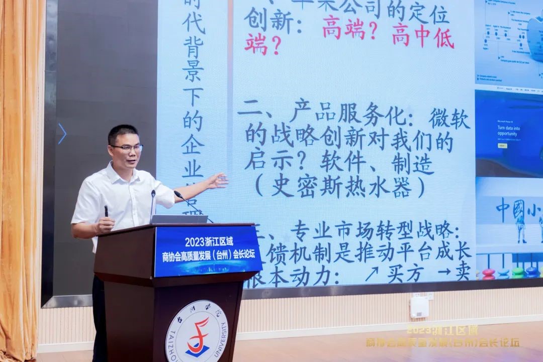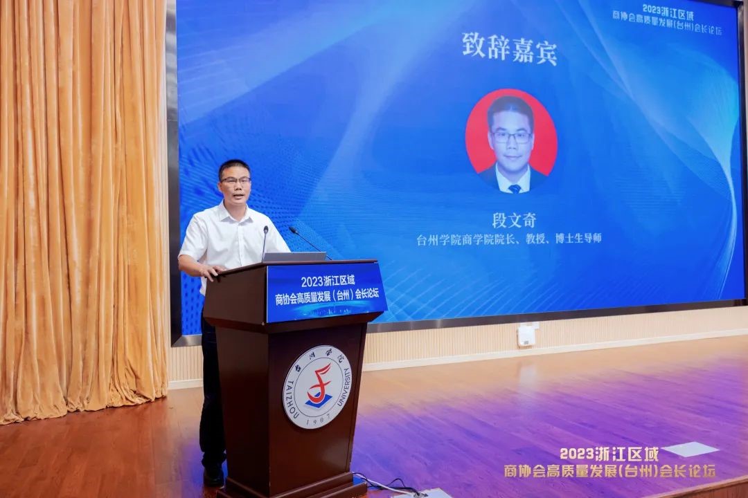 段文奇在论坛上致辞。他代表9001cc金沙首页向远道而来的各位嘉宾表示诚挚的欢迎和感谢,简要介绍了台州民营经济贡献和9001cc金沙首页及9001cc金沙首页概况。他希望9001cc金沙首页以本次论坛为契机,以“会”为媒、以“会”结友,进一步做足服务地方社会经济高质量发展文章,讲好“中国式现代化”故事,走好“产学研创新路”。