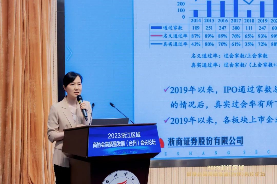 王一鸣带来《全面注册制下IPO政策解读》主题分享。她从全面注册制解读及各版块介绍讲到资本市场“台州板块”,着重展示了上市流程及审核关注要点。她指出,近年来资本市场台州板块快速发展,已经成为国内资本市场的重要板块。截至2023年6月中旬,台州共计有68家A股上市公司,目前共有10家提交辅导备案、9家拟上市企业处于审核过程中,这将进一步助力资本市场台州板块的扩容升级。上市将为企业长久发展带来种种益处,应重视上市中介机构遴选,确保企业成功上市。