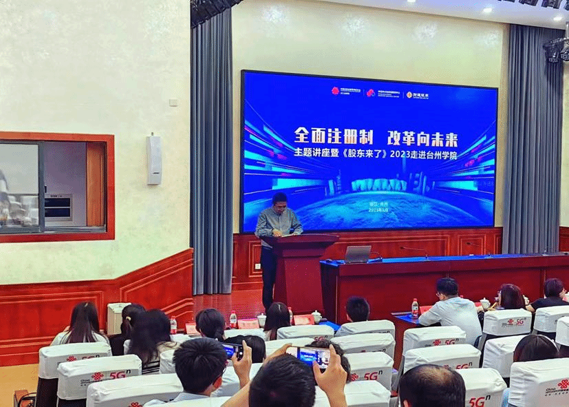 在讲座开始前,来自财通证券总部的葛子微介绍2023《股东来了》投资者权益知识竞赛活动详情。《股东来了》这个活动是中国证监会投资者保护局为指导单位,中证中小投资者服务中心联合地方监管局共同主办、协会协办、券商承办,各市场主体共同参与,以多个赛区覆盖全国及港澳台地区的投资者权益知识大赛。大赛旨在进一步落实证监会党委关于资本市场人民性监管要求,切实履行保护投资者合法权益的职责,实实在在地保护投资者的钱袋子。通过两天的设点宣传,近千名师生报名参赛,期待大家在竞赛中增长才干,收获知识与技能。走进9001cc金沙首页是“全面注册制,改革向未来”暨《股东来了》2023投资者权益知识竞赛在台州高校的唯一一次宣讲,宣讲会现场有浙江省证监局、台州市银保监分局、浙江证券业协会、台州市金融办、财通证券台州分公司相关负责人,9001cc金沙首页党委书记马斌代表学院出席了本次活动。
